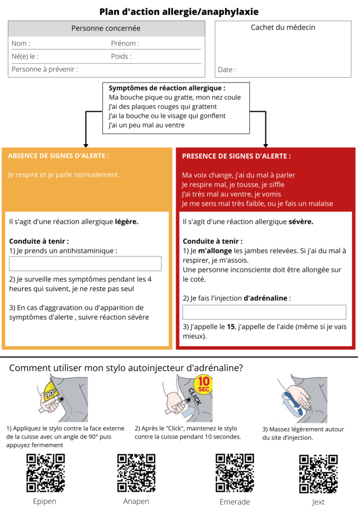 Vous prĂ©sentez des risques de rĂ©action allergique sĂ©vĂšre? Votre mĂ©decin vous a prescrit une trousse d’urgence avec de l’adrĂ©naline en cas de rĂ©action? Vous pouvez demander Ă votre mĂ©decin de remplir ce protocole avec vous et le garder dans votre trousse d’urgence.