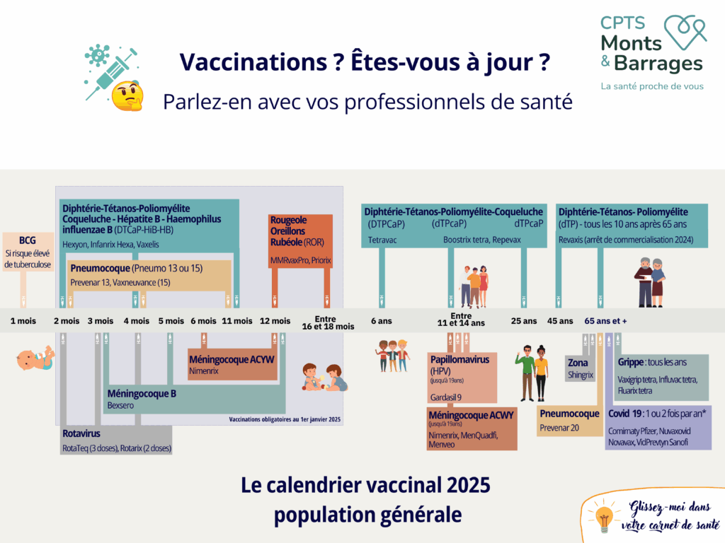 Vous trouverez ici (site de la CPTS Monts et Barrages), le lien vers les recommandations vaccinales en vigueur en 2025, ainsi que des détails sur certaines vaccinations recommandées (Papillomavirus, Pneumocoque, Grippe ou Covid).